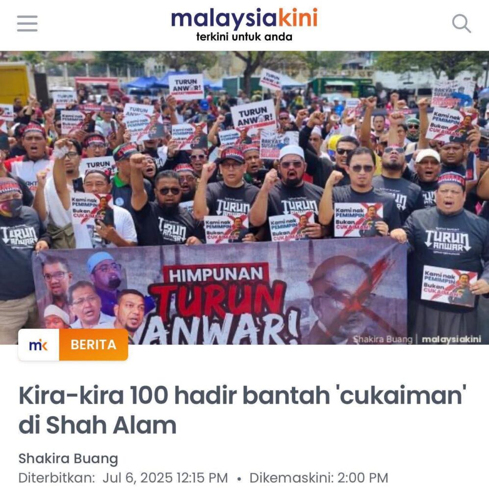SHAH ALAM, 6 Julai 2025 – Himpunan “Turun Anwar” anjuran Dewan Pemuda PAS Selangor di Shah Alam hari ini menerima tamparan hebat apabila kehadiran peserta dikatakan jauh lebih rendah daripada yang didakwa penganjur.