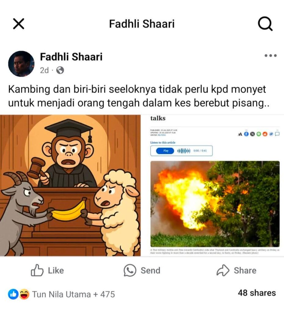 “Perbandingan antara dua perkara yang amat berbeza dari segi konteks dan niat ini memperlihatkan kegagalan memahami batas antara seni, adab dan propaganda politik,” ujar beliau lagi.