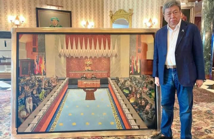 “Lukisan yang dibeli oleh Tuanku hanyalah sebuah karya seni kritikan umum terhadap parlimen secara kolektif, bukan ditujukan kepada mana-mana individu, dan digunakan untuk tujuan amal kebajikan. Ia tidak wajar dijadikan bahan serangan politik murahan,” tegas beliau.
