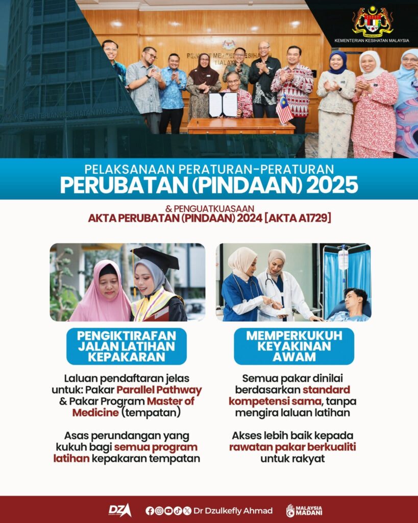 PUTRAJAYA – Bermula hari ini, sistem kesihatan negara melakar sejarah baharu apabila Akta Perubatan (Pindaan) 2024 [Akta A1729] dan Peraturan-Peraturan Perubatan (Pindaan) 2025 secara rasmi mula dikuatkuasakan, menurut kenyataan yang dikeluarkan oleh Menteri Kesihatan, YB Datuk Seri Dr. Dzulkefly Ahmad.